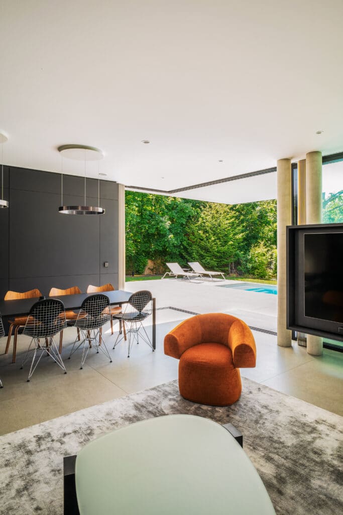 Pour pousser l’expérience encore plus loin, nous combinons souvent l’angle sans poteau avec la technologie de la baie vitrée à galandage.